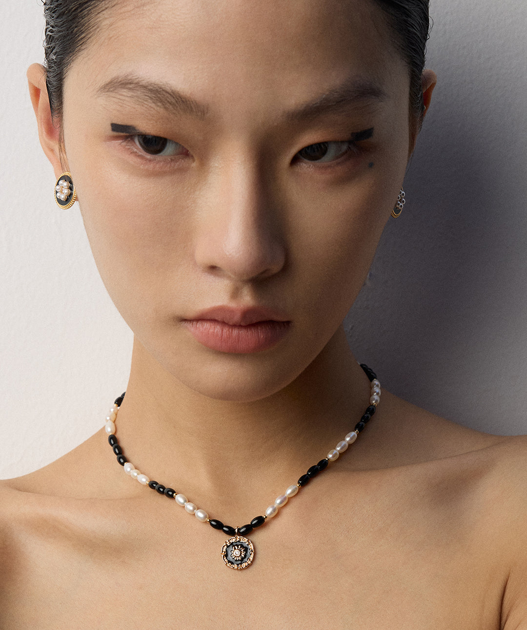 Ein Statement aus Eleganz und Kontrast: Diese Halskette vereint echte Süßwasserperlen mit schwarzen Glasakzenten und einem kunstvoll verzierten, floralen Anhänger in antikgoldener Optik. Der Mittelteil glänzt mit einer Mischung aus Zirkonia und Tropfenharz, eingefasst in 925er Sterlingsilber. Der Wechsel aus Perlen und dunklen Elementen verleiht der Kette Tiefe und Charakter – perfekt für selbstbewusste Looks mit Vintage-Flair.
