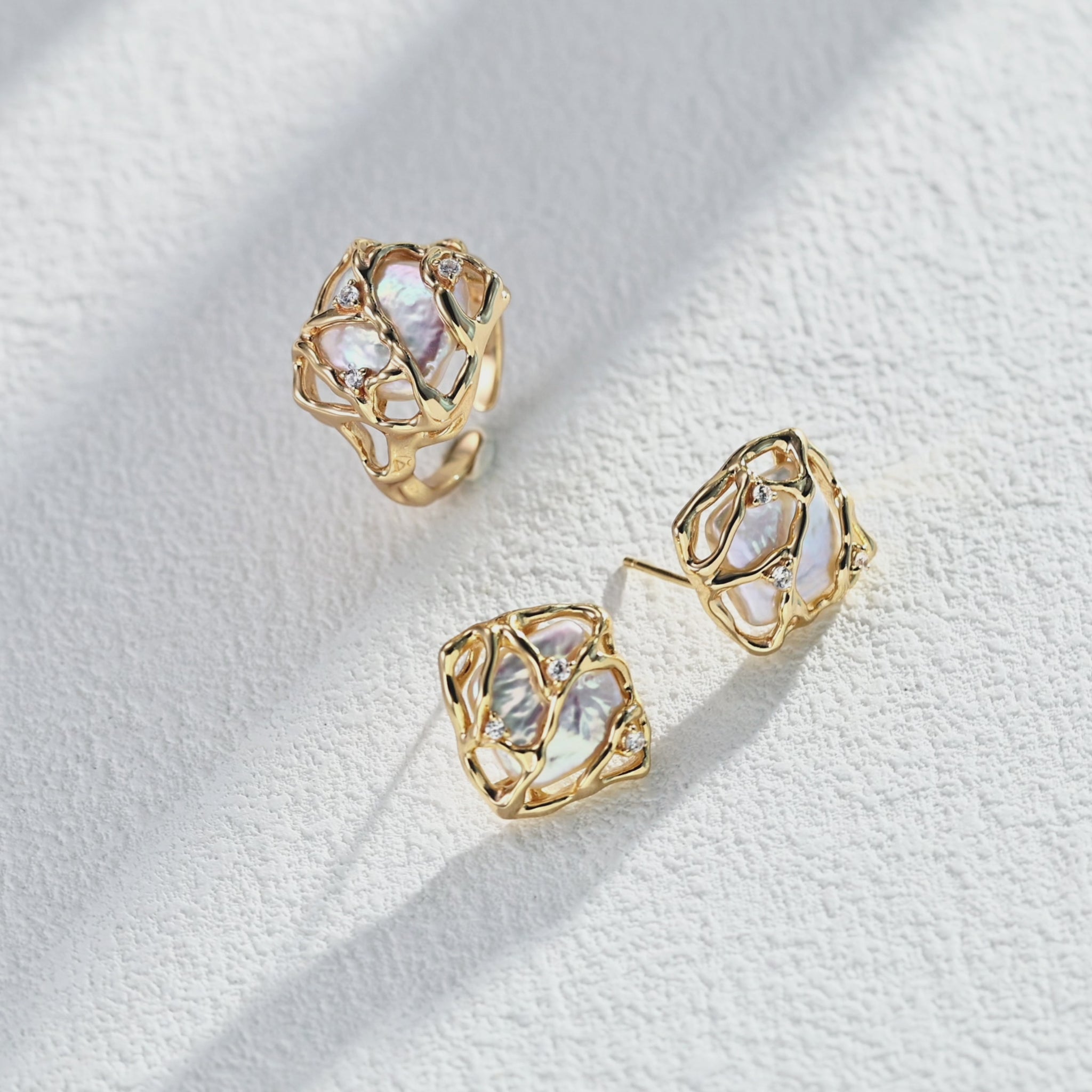 Die organische, geschwungene Form umschließt ein Stück echten, natürlich gewachsenen Perlmutt, dessen Schimmer sich je nach Licht verändert. Feine Zirkonia-Steine setzen zarte Highlights und lassen den Ring wirken, als würde er Licht einfangen.