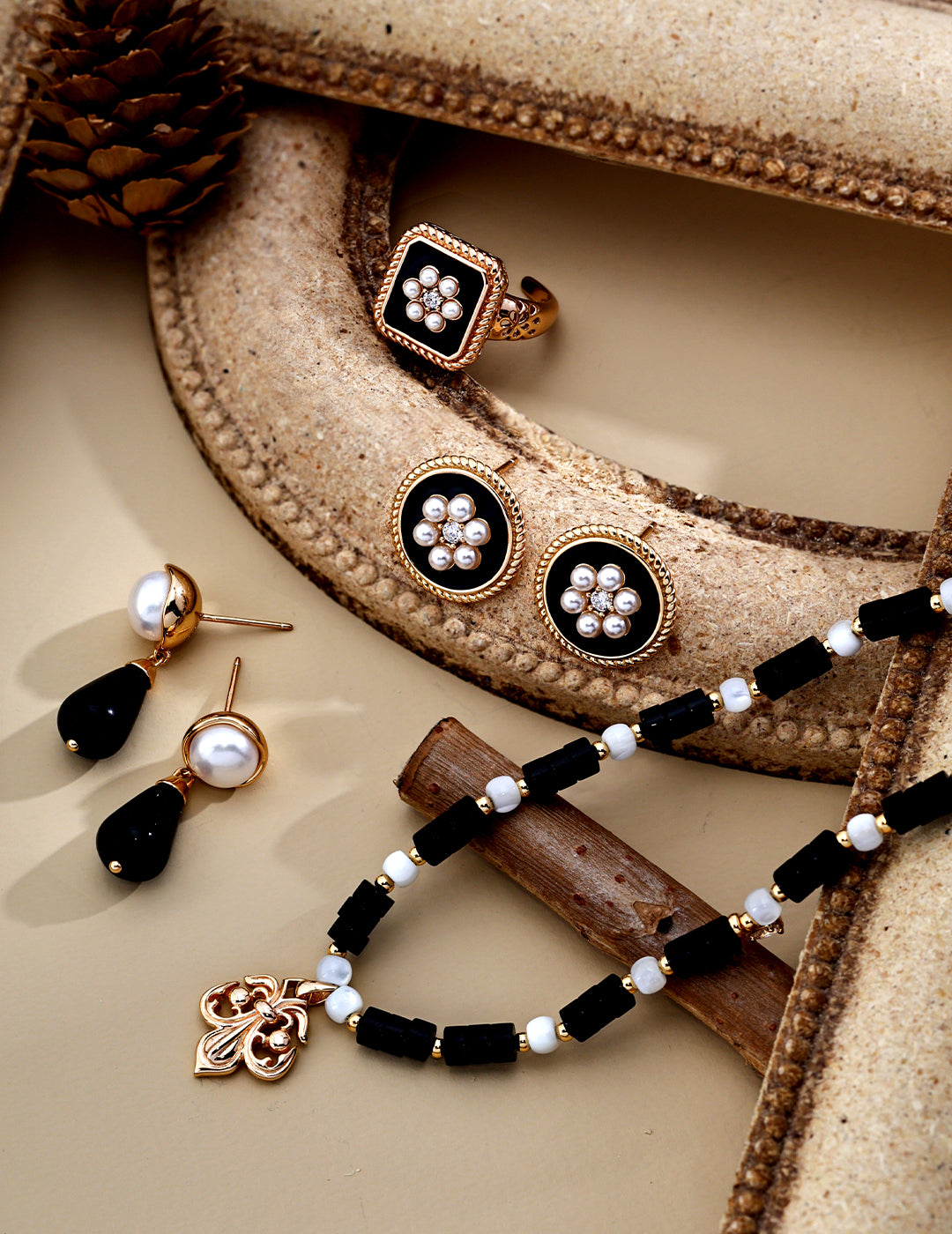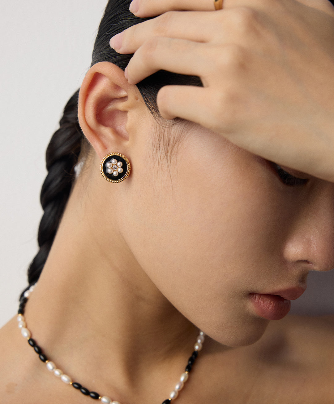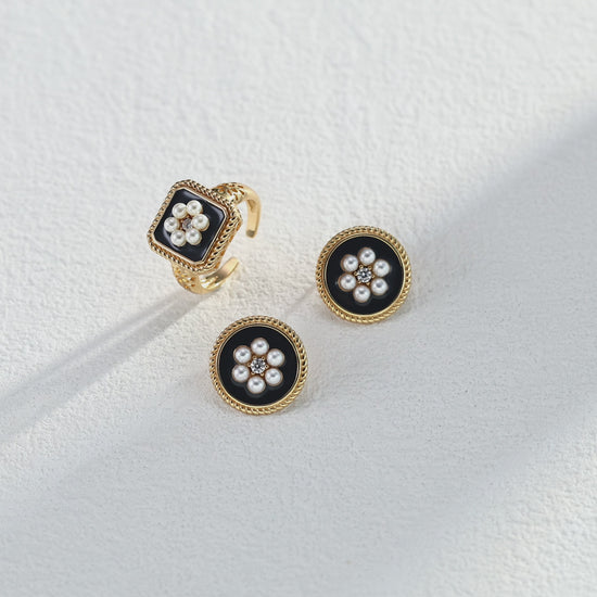Diese runden Ohrstecker aus 925er Silber vereinen klassische Eleganz mit einem modernen Vintage-Touch. Der schwarze Emaille-Look im Zentrum hebt das florale Perlenmuster stilvoll hervor, während ein feiner, goldfarbener Rahmen dem Design Tiefe verleiht. Die Kombination aus glänzenden Kunstperlen und dezentem Zirkonia sorgt für einen edlen Auftritt – ob im Alltag oder bei besonderen Anlässen.